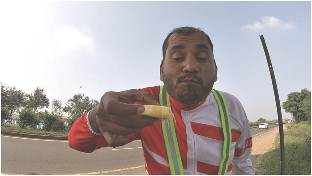 We all woke up at 4 a.m. to start our further journey at 5 a.m., got a little delayed as Hetav forgot where he kept his cycle lock keys, finally got the key & then we started our ride at 5:20 am The atmosphere out was pleasant & we could cover a reasonable distance in a short span of time, the temperature started rising dramatically. Halted at a restaurant on the highway around 8:30 am where we had poha & tea, rested for some time. We decided to halt at Kolhapur which was around 25 kms away, reached Kolhapur at 10:45 am, halted under a tree little ahead of Kolhapur & were waiting for Fareeda & Hetav to join as they still had to cover 3-4 kms. Meanwhile, our support Dr. Archana took a detour to meet her relative’s place at Kolhapur. As the sun was soaring we started from there to halt at Kagal, support team found out a place near the highway to relax a little and to freshen up, the next was Tavandi ghat near Nippani. On the way we were blessed with fresh pineapple which probably appeared as the best thing on earth at that point of time. Javed bhai’s expressions says it all ☺
